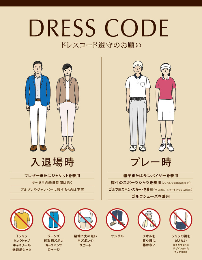 - ・プレーヤーは必ず襟つきのスポーツシャツを着用して下さい。Tシャツ、ジーパン類、迷彩柄ウェア、ノースリーブはご遠慮下さい。